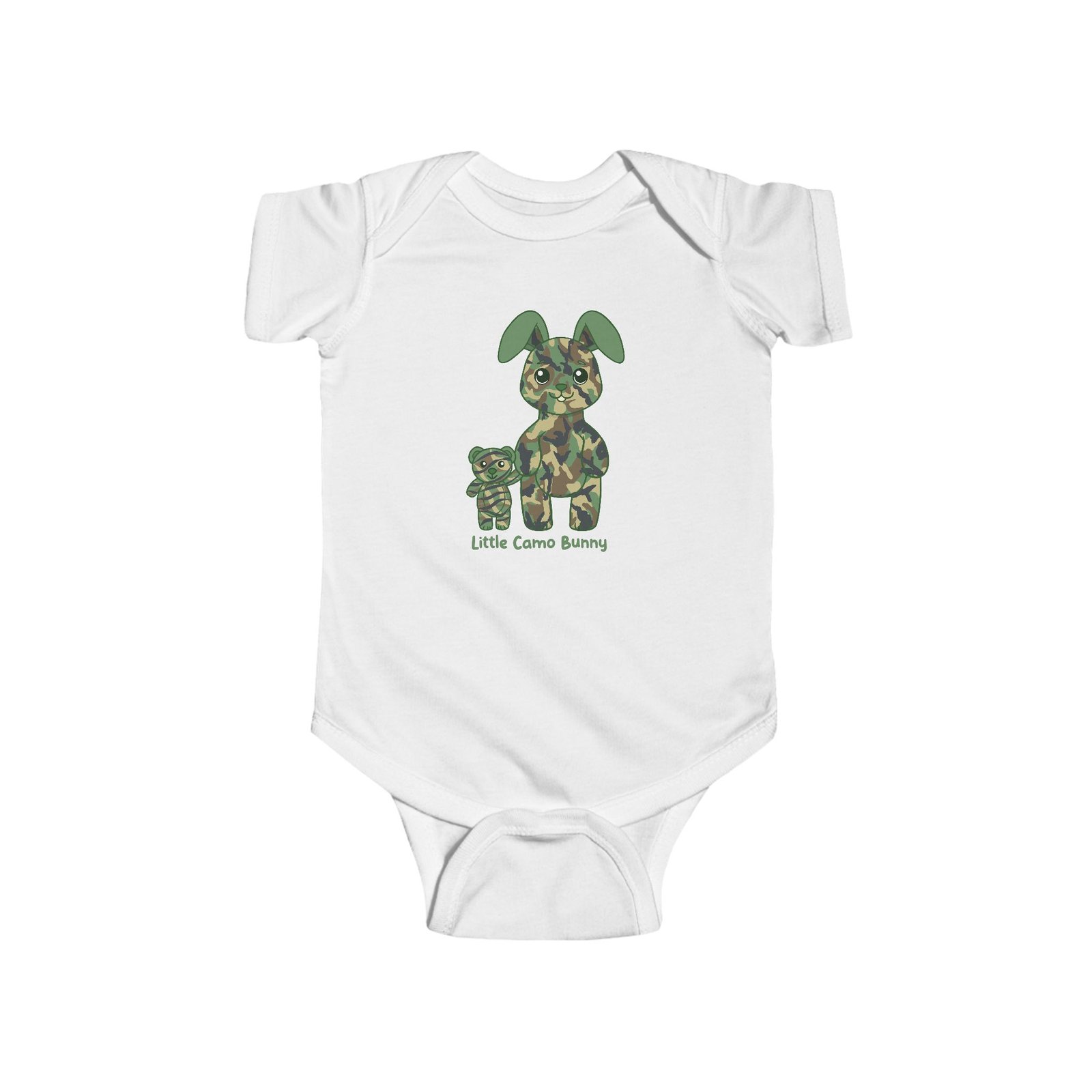 Be the first to review “Little Camo Bunny Infant Fine Jersey Bodysuit in White”